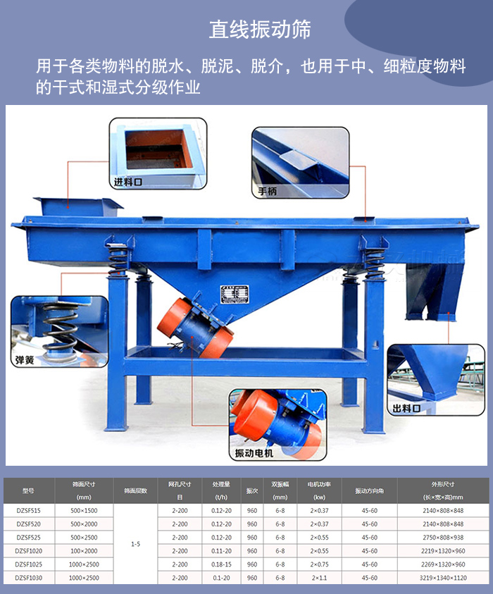 直線振動篩篩箱的運(yùn)動軌跡為直線或接近直線,它有兩個軸,所以又稱雙軸振動篩。直線振動篩水平或傾斜安裝,這類振動篩結(jié)構(gòu)緊湊,運(yùn)行平穩(wěn),被廣泛用于各類物料的脫水、脫泥、脫介,也用于中、細(xì)粒度物料的干式和濕式分級作業(yè)。我廠生產(chǎn)的直線振動篩種HZSF型號就是直線振動篩代表性的產(chǎn)品。