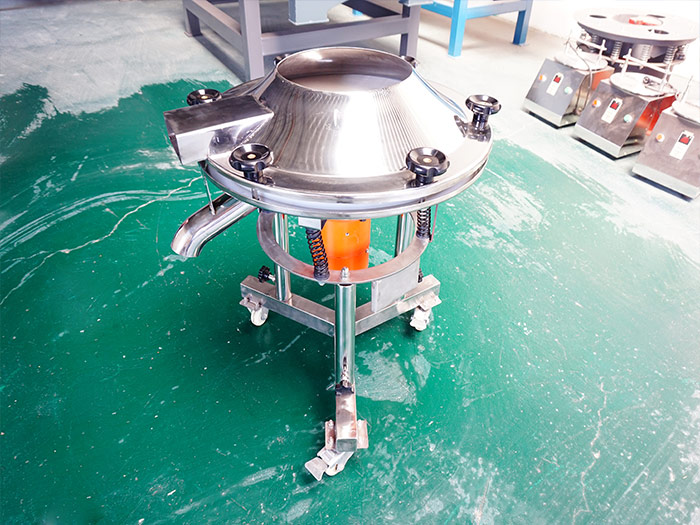 450過濾篩——直徑為450mm,由電機驅(qū)動重錘激振,篩體產(chǎn)生水平、垂直、傾斜的三次元運動,使含水物料在篩網(wǎng)上被拋起并由中央向外旋轉(zhuǎn)擴散到出料口排出,含水物料在篩網(wǎng)上面的運動中,細小顆粒或液體透過篩網(wǎng),通過選擇安裝相應(yīng)的篩網(wǎng)和篩網(wǎng)層數(shù)使物料完成篩選分級或過濾,分選出的物料由各自的出料口分別自動排出。是一臺單層篩分和過濾使用的振動篩,被各個廠家和用戶叫做液體專用振動篩,因為機身小的原因,所以它的處理量不多,適用于小產(chǎn)能要求。