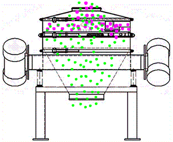 直排振動篩結(jié)構(gòu)分為進料口、防塵蓋、篩框篩網(wǎng)、束環(huán)、出料口、電機、彈簧和底座。
