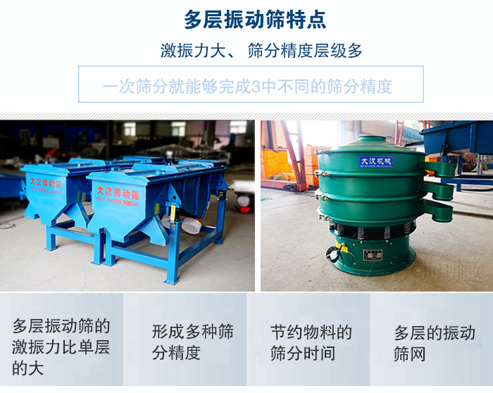 多層振動(dòng)篩可對(duì)粉狀、顆粒狀物料的篩選和分級(jí),廣泛用在塑料、磨料、化工、醫(yī)藥、建材、糧食、炭素、化肥等行業(yè).